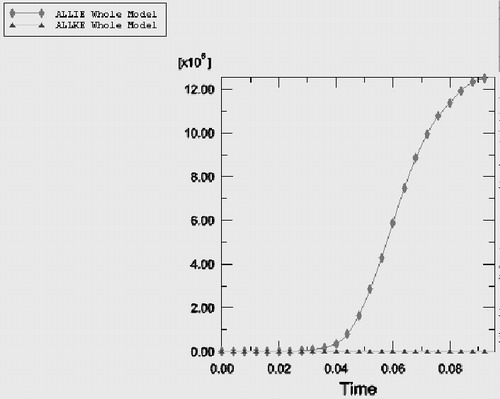 本實例模擬油箱的沖壓成型過程。圖3所示為實際成型時油箱的一半的形狀。考慮到在沖壓成型過程中,油箱結(jié)構(gòu)的對稱性,本文通過模擬圖3左下所示的結(jié)構(gòu),對其進行模擬分析,達到分析整個油箱成型的目的。首先,通過ABAQUS/CAE完成圖3右側(cè)所示的裝配圖,其中平面鋁板將被沖壓成型為圖3左下的結(jié)構(gòu)。成形的全過程如圖4所示,模擬結(jié)果跟實際生產(chǎn)過程相吻合。其中,圖5所示為整個過程中內(nèi)能和動能的變化曲線,可以確定模擬過程為準靜態(tài)。圖6表現(xiàn)的是成型后金屬板的厚度分布云圖。圖7給出了與厚度變化違禁詞處的單元相關(guān)的四個節(jié)點處的厚度在時間域內(nèi)的變化曲線。